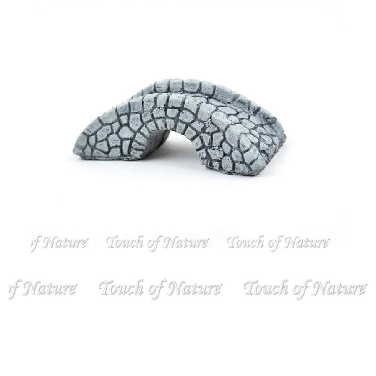This bridge is made of resin. This stately bridge has a gray cobblestone walkway and raised gray stones on the sides. It would look great with one of our castles, stone gates, rustic gazebo, medieval horse and some sitting fairies. Look for them and other miniatures in our collection.