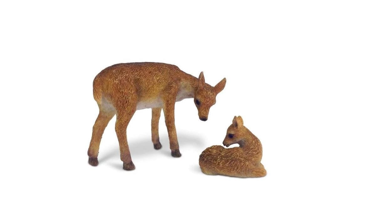 These miniature deer are made of resin. The mother deer is looking over her baby, keeping it safe from harm. The fawn is curled up , resting quietly. They are both covered in a textured light brown.This pair would make a realistic addition to your holiday fairy garden, Christmas centerpiece, train village or city scape.