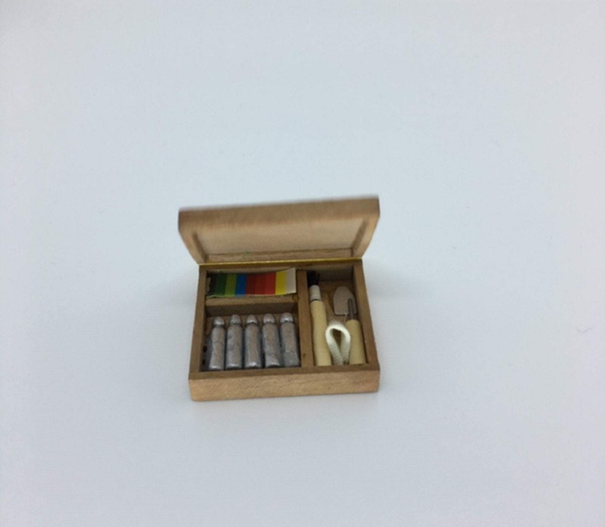 This adorable paint set is in a box that opens up to show faux artist supplies. There are faux colored pastels, tubes for paint, a brush, cloth and tools. The box is made of tan wood and has no words or decorations on it. This miniature set is the perfect addition to a dollhouse or display!