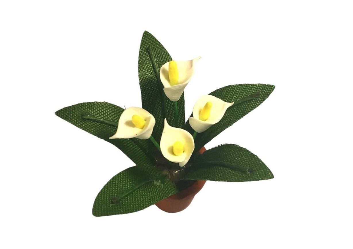 This miniature artificial plant is made of clay and fabric. A terracotta pot holds this lovely peace lily plant. The white flowers with a yellow center are made of clay and are attached with wire. The green leaves are made of fabric. Each leaf has a wire attached so that the leaf can be shaped to a desired position. This lovely miniature flower can adorn a dollhouse, a fairy garden, a miniature floral shop or shadow box.