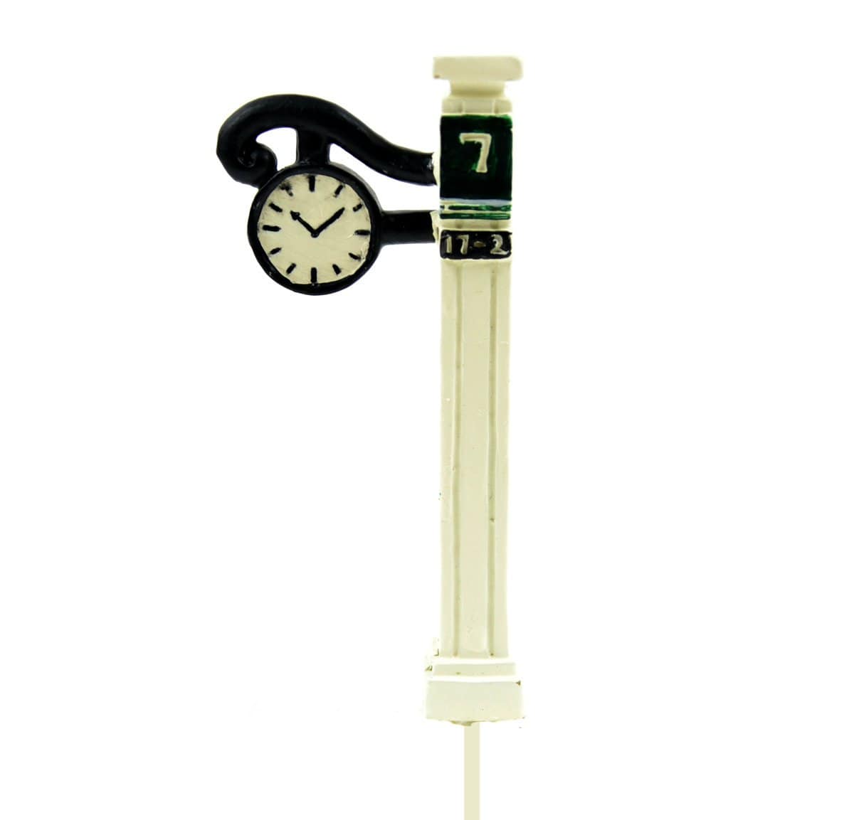 Crafted from painted metal, the white post has the number 7 on it. The clock hangs from a black iron curve. This street clock exudes a vintage and nostalgic look that's perfect for decorating the exterior of a dollhouse or fairy garden.