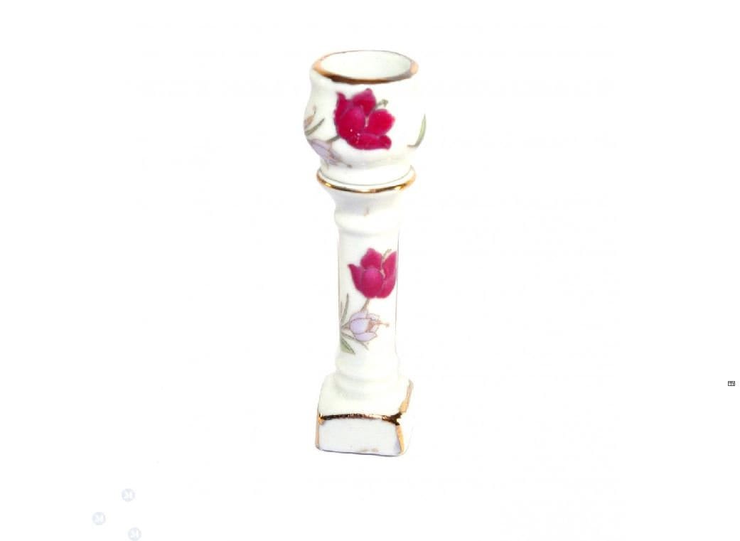 This dollhouse miniature is made of ceramic porcelain. It comes in 2 pieces. The round planter/bowl can sit on the 2.25" pedestal base. Both the bowl and the pedestal are decorated with a motif of a red flower with green leaves. The edges of each piece are lined with gold paint. The bowl/planter can be set on the pedestal or it can be used separately. Either way, this jardinière will add a touch of elegance in a dollhouse, shadow box, or miniature setting.