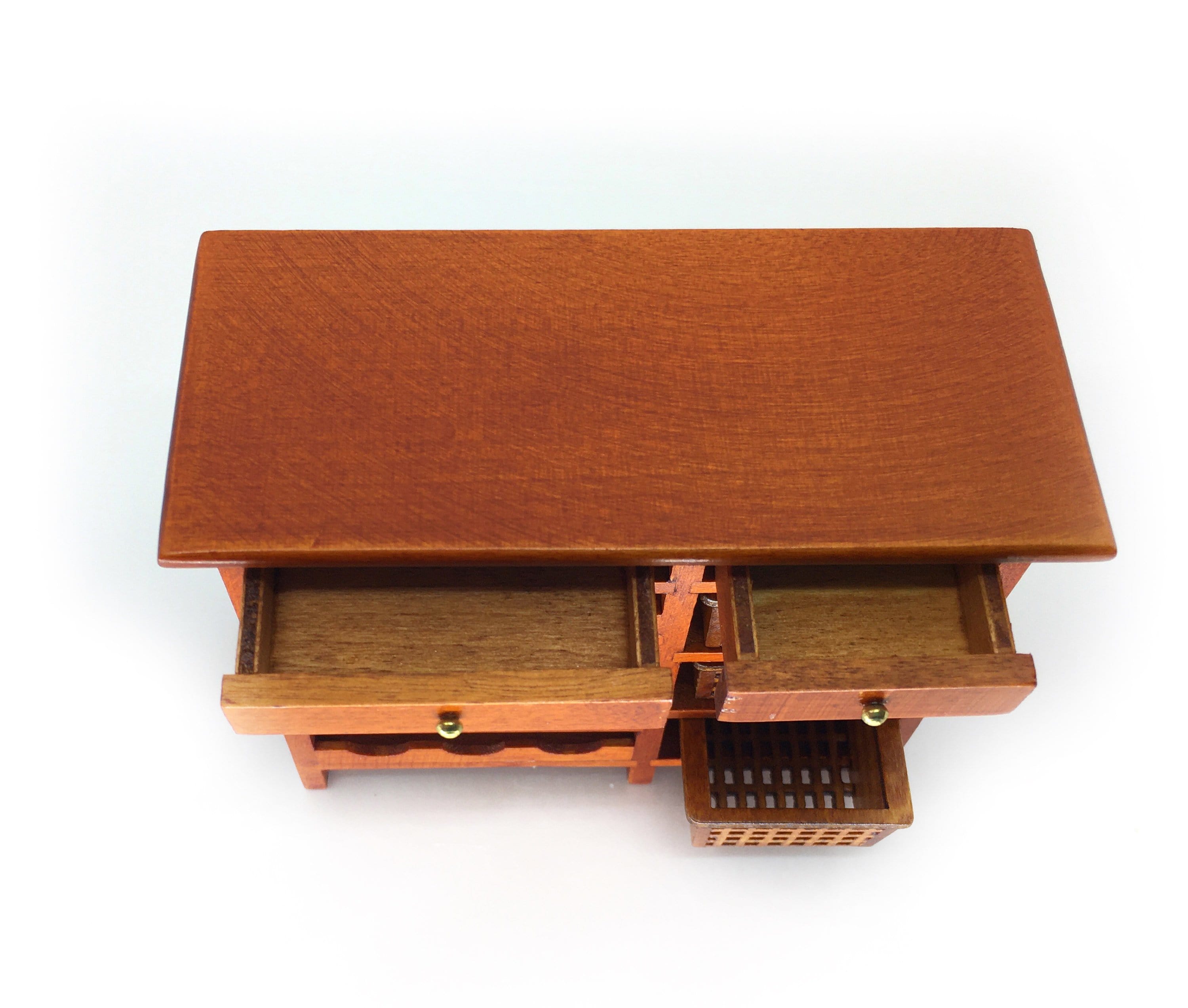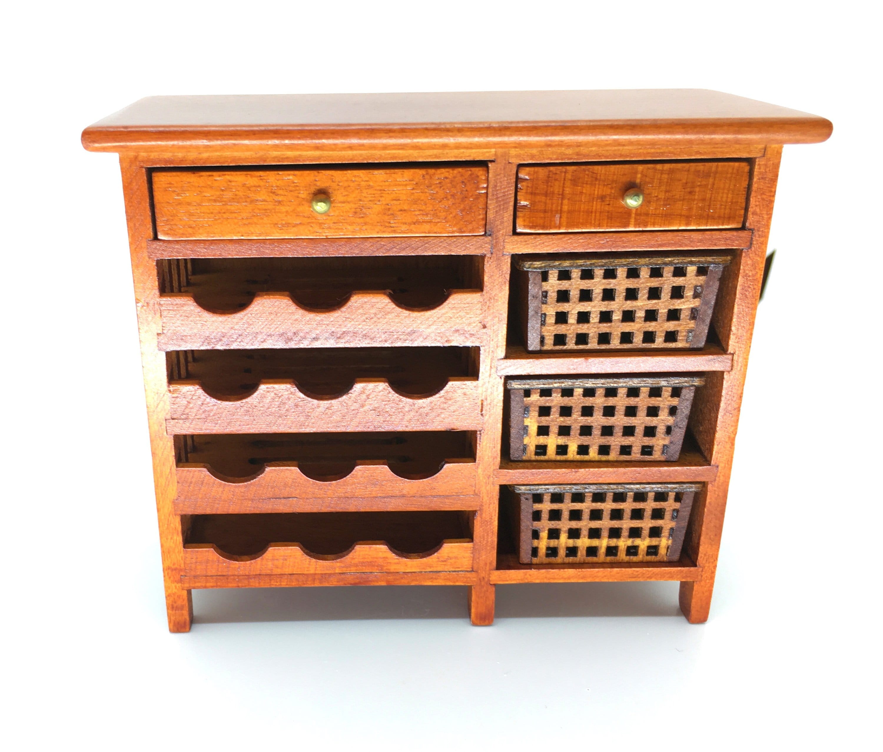 This gorgeous dollhouse cabinet is made of wood. It has 2 drawers at the top and 3 wood bins with a grid pattern on the side. You can pull them out. There is storage for wine bottles as well. This is a unique piece that can be used in a dining room, living room or den of a dollhouse. - Brown wine and storage cabinet - Made of wood - Approximately measures 4.25L x 3.5H x 1.75W - 1 piece -1:12 scale