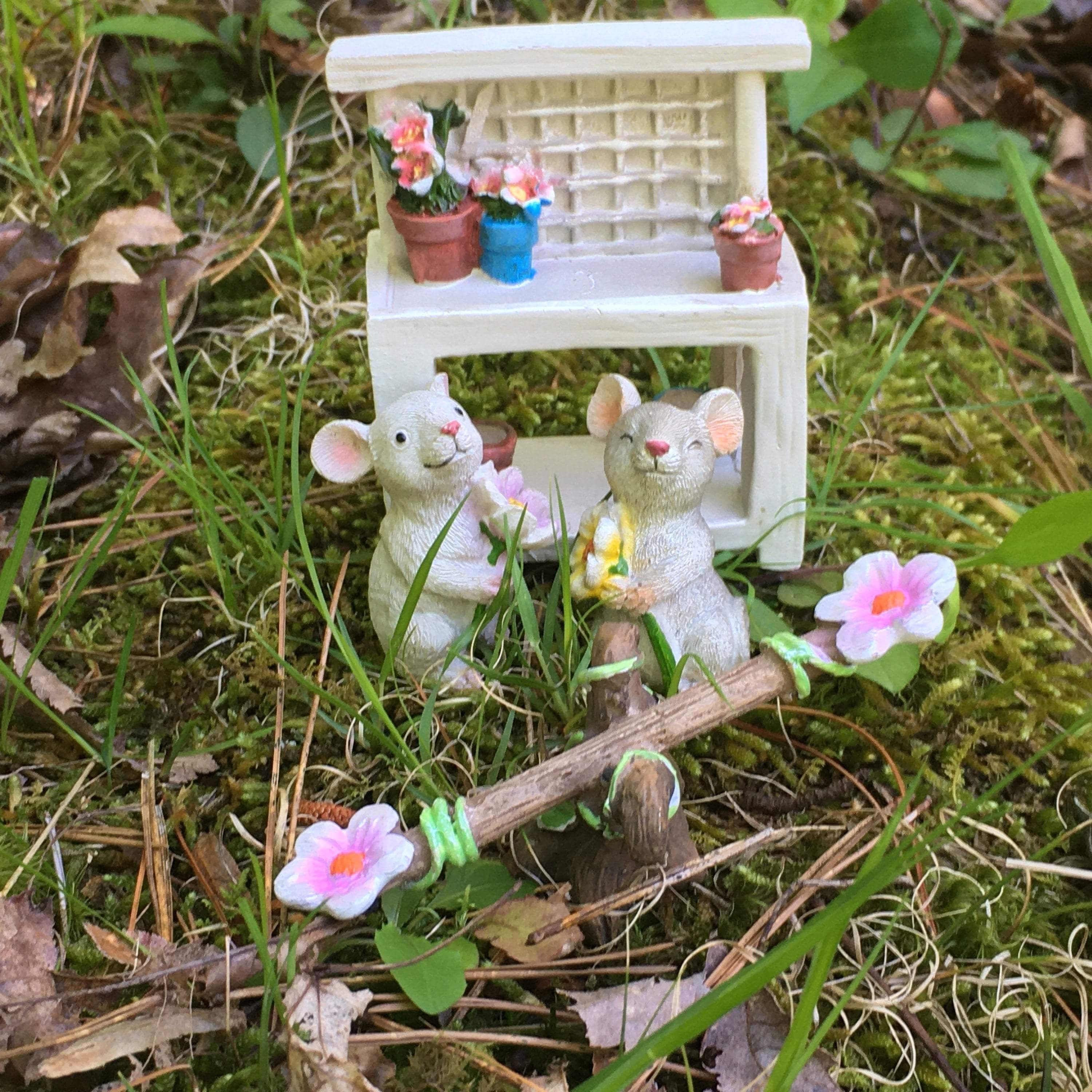 This fairy garden kit comes ready to make! Two mice are holding onto yellow and pink flowers. They have a white garden stand with 2 shelves ready to fill with the flowers as they bloom. When it is time for fun, they have a pink flower seesaw to play on! This Mouse Fairy Garden set can be complete with these pieces. If you want to add more, we have lots to choose from in our collection of miniatures!