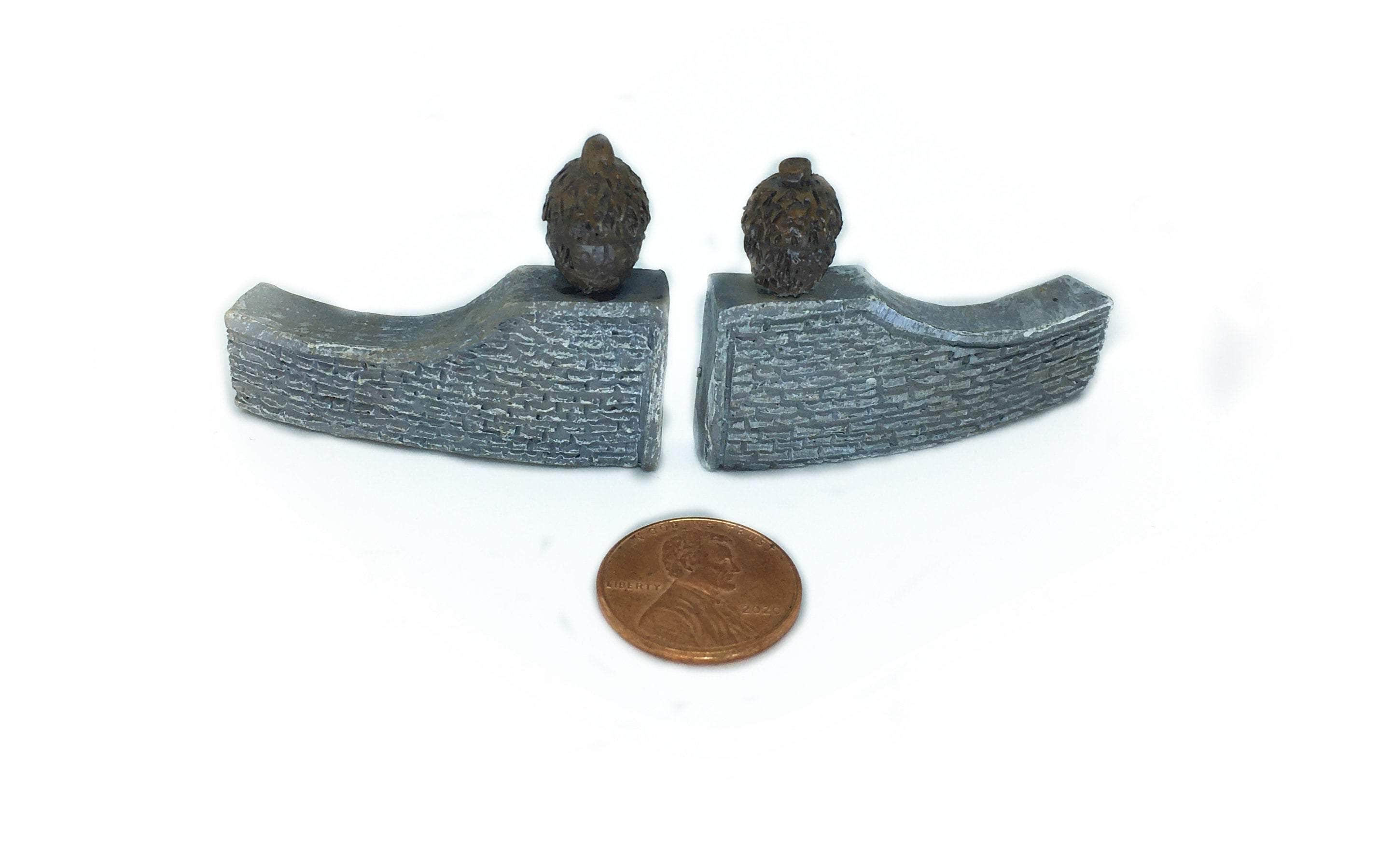 This adorable micro miniature entry way is made of resin. The gray walls have textured brick detail on both sides. The top of these pieces are smooth. The walls curve upward and are adorned with a brown acorn. At 1.75" long and 1.5"high, this is the perfect size to use in a terrarium or small garden scene. You can add a micro house, bridge, fence, rustic garden tools and gnomes. Look for those and other miniatures in our collection.
