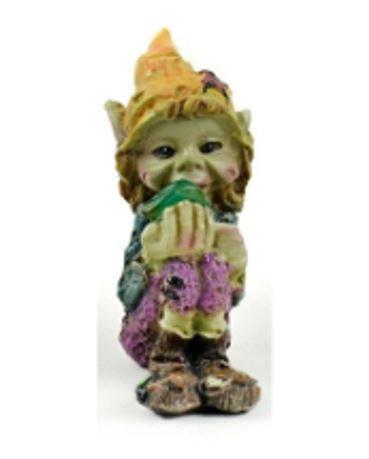 This pixie is made of resin. He is dressed in muted colors of blue, purple and orange. He is holding a green gem...Does it serve a purpose? Maybe its a relic to another universe, only the pixies know the real truth and they're not telling Create a fun garden with him and some pixie friends, a Nutty nook house, a pond, a gazing ball and some miniature animals. Look for those and others in our collection.