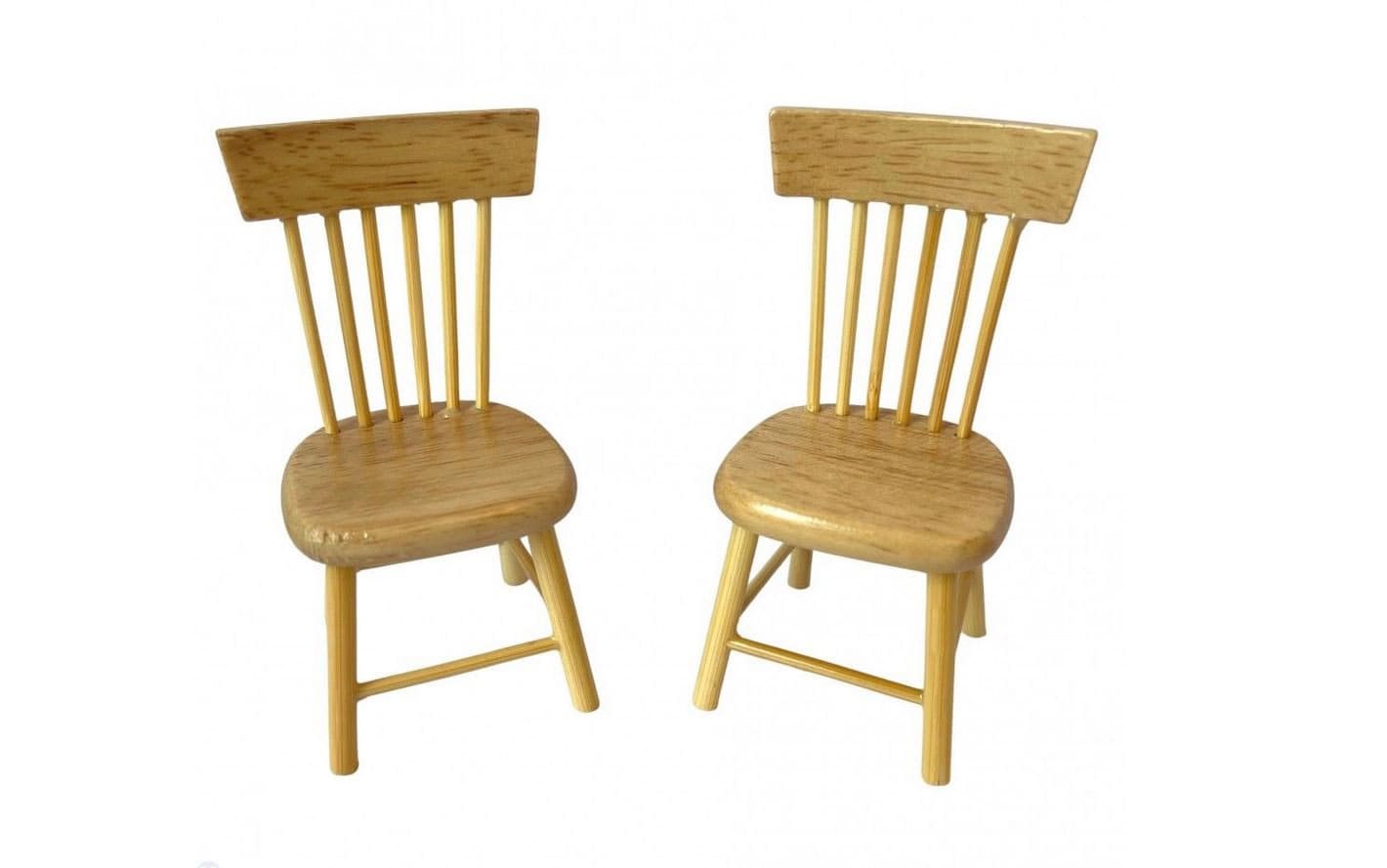 These 2 miniature chairs are made of wood. They are a modern version of a Shaker chair, with round, vertical slats connected to the top rail. The pair of chairs has a natural wood color with a satin finish so the grain of the wood shows through. These versatile chairs can be used in a dollhouse kitchen, dining room, or as accent chairs in another dollhouse room.