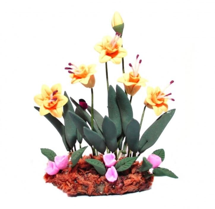 Every fairy garden or dollhouse yard needs colorful flowers growing. The flowers are made of clay attached to thin wire stems. The yellow daffodils have pink flowers growing under their leaves. A ladybug sits on one of the leaves. They are growing on a mound of textured brown 'mulch'. They would add color and an authentic touch to any project. Add them to a fairy garden with one of our fairy garden houses, a wishing well, a leaf birdbath, friendship fence and some miniature animals. Look for those and other miniatures in our collection.