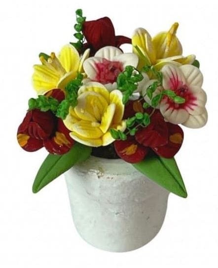 This beautiful flower miniature is made of clay and resin. A painted white planter holds green leaves and multi colored flowers of yellow, white and deep red. The flowers are made of clay and have wire stems. This miniature would look beautiful in a dollhouse, a shadowbox, a garden display, or miniature floral shop. Where can you use it?