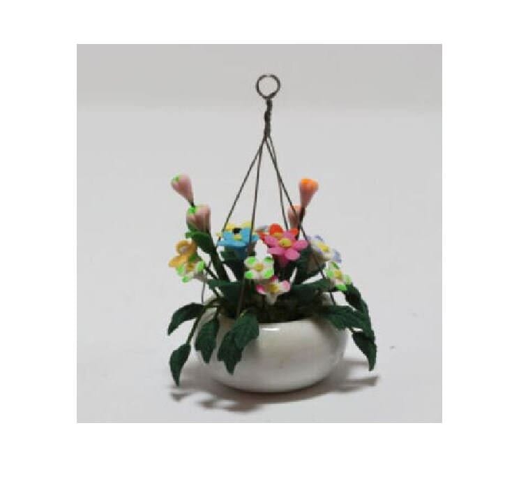 This is an exquisite pot of miniature artificial flowers! Much like an arrangement one would get from a florist, this round, white ceramic pot has a mix of flowers. The flowers are bright, spring colors. The flowers in a in variety of pink, yellow, blue and orange colors. Dark green leaves surround the inside rim of the planter. They are in a round glazed white pot with a wire hanger. The wire is looped at the top for hanging. This is a sweet basket of flowers to hang from a shepherd's hook or plant hanger. Where can you use it?