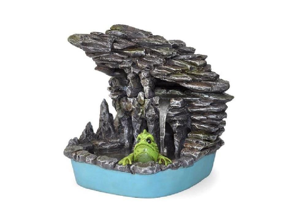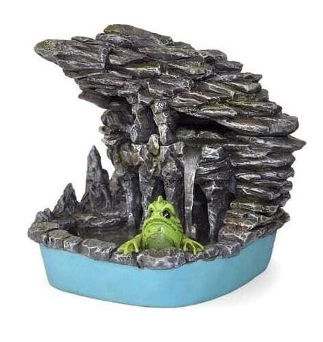 This adorable miniature is made of resin. The oval blue base is meant to be placed into the ground and can be filled with water. The lagoon is made of gray stacked stone arranged to form a round cave. The cave has 2 open sections. A waterfall, made of resin, is falling from the top into a pool of clear resin. A lonely green swamp monster is looking out over the stone ledge. It needs a friend! Use this lagoon alone or look in our collection to find other miniatures to use with this swamp lagoon!