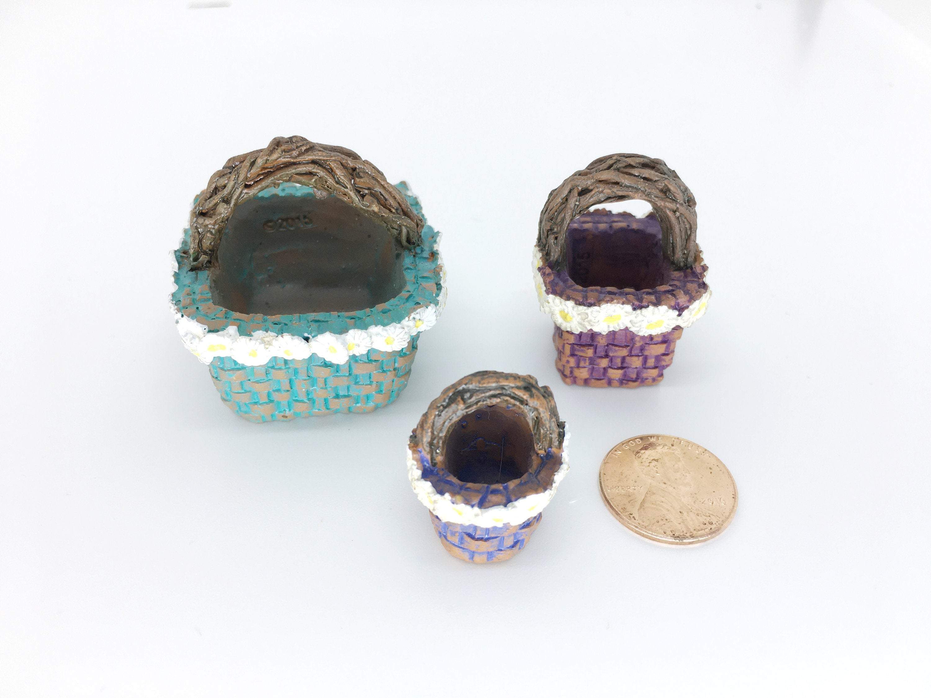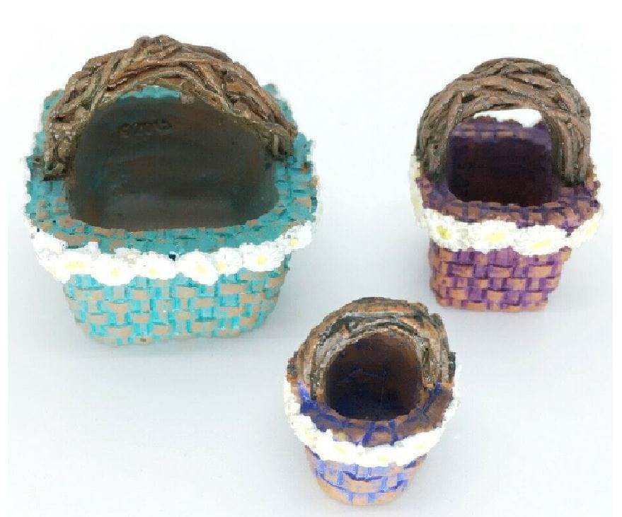 This basket set is made of resin.  The sides of the baskets have two tones:  a brown weave with a color. The largest square basket is aqua blue.  The medium square basket is purple and the small  round  one is blue.  Each of them are lined with a row of daisies  around the top edge.  They have brown handles that look like twisted branches.  The set of 3 vary in size from 1.5" high to 1" high.  They are the perfect accessory to a fairy garden, terrarium, or display.  Create a garden with a solar house, some fairies,  a pond, a fence, welcome sign and some miniature animals.  Look for those and other miniatures in our collection!