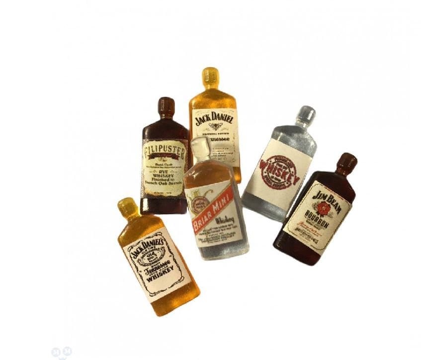 Get the wee folk's party started with this mini set of liquor bottle replicas. They are labeled with different names. There are 2 bottles in each color: brown, orange and clear. Each bottle is approximately .75" high and .25" wide. They are 1:12 scale and will fit nicely in a dollhouse, shadowbox, miniature restaurant or bar diorama. They add a realistic touch to any setting!