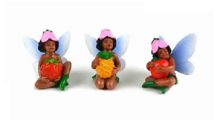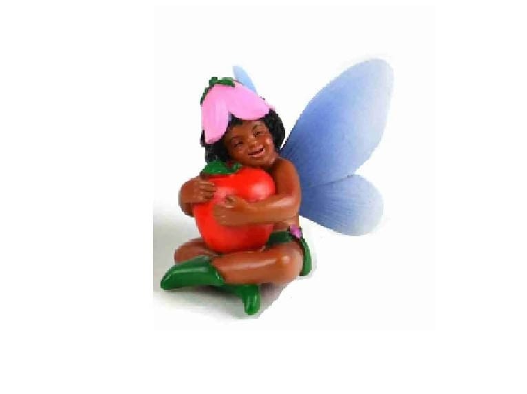 This miniature fairy is made of resin. This brown skinned little baby wears green clothes and shoes. She has a pink flower cap. Her wings are white with tinges of blue. She is smiling as she hugs the red apple. This adorable miniature can be used in a fairy garden, on a table scape, as a cake topper or a special gift. How will you use her?