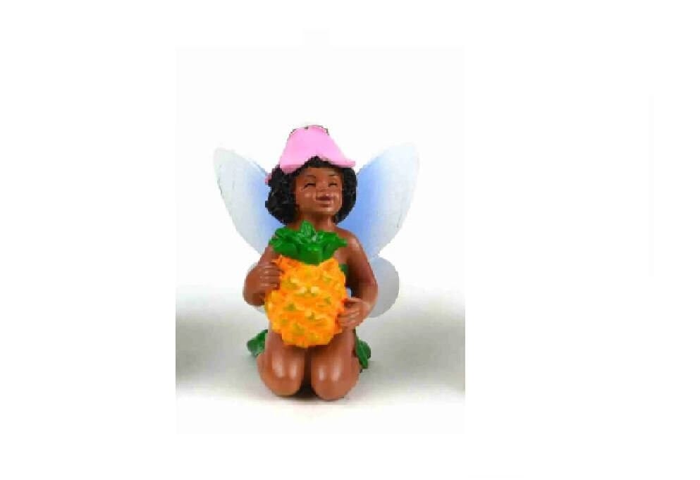 This miniature fairy is made of resin. This brown skinned little baby wears green clothes and shoes. She has a pink flower cap. Her wings are white with tinges of blue. She is smiling as she hugs a yellow pineapple. This adorable miniature can be used in a fairy garden, on a table-scape, as a cake topper or a special gift. How will you use her?