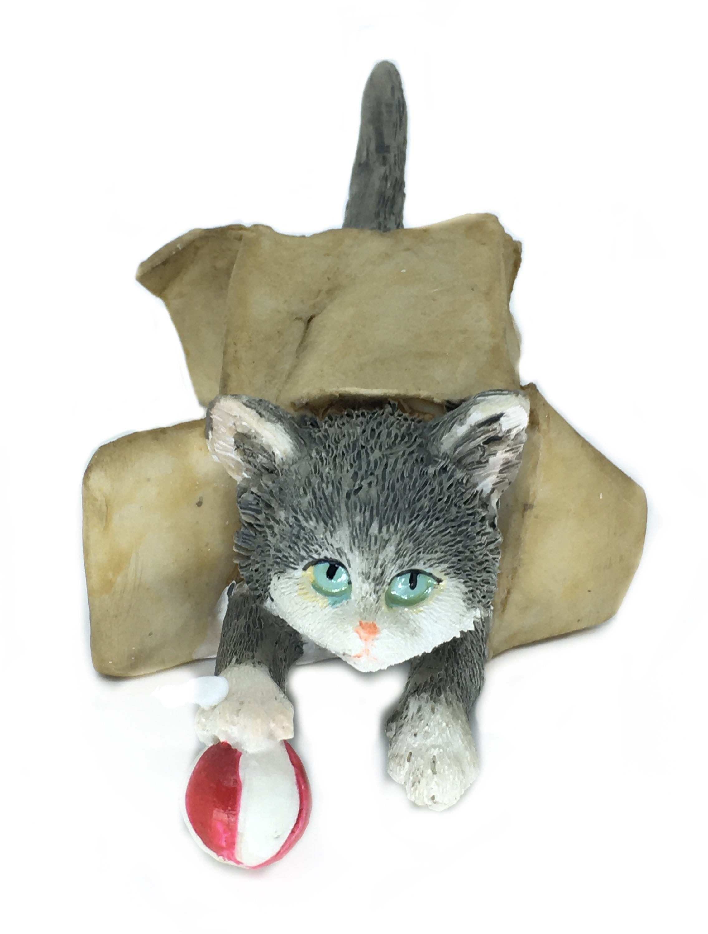 This mischievous cat is made of resin. It has gray and white textured fur. It has crawled through this brown box in search of the red and white ball which he has finally caught under his paw. His green eyes are looking straight ahead as if he hasn't a care in the world! This miniature would be a perfect gift for that person who loves cats. It would be sweet in a fairy garden, table centerpiece, dollhouse or diorama.