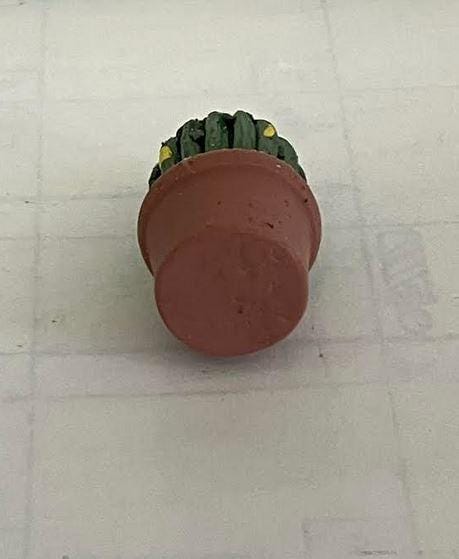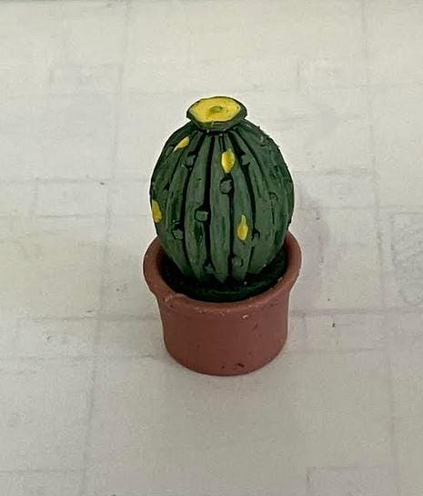 This miniature cactus plant is made of resin. The round green cactus with a yellow top and yellow spots stands in a smiling terracotta pot. This is a welcomed accessory in a desert scene with armadillos or llamas.