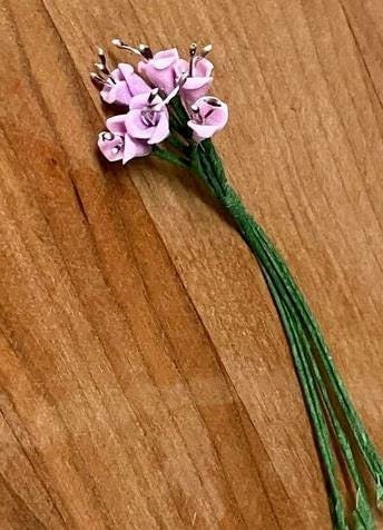 These miniature flower stems are made of clay with wire stems. There are 6 light purple flowers on green wrapped stems. The 6 flowers are bound together with green floral tape that can easily be cut off to make separate stems. Or you could keep them together. The flowers with their stems are approximately 3" long. The wire stems can be cut to fit a vase or basket as needed. These work great in a dollhouse, fairy garden, or diorama,