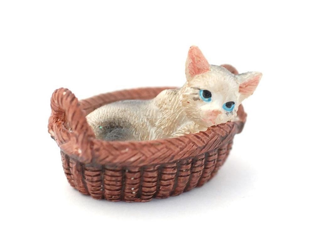 This adorable miniature is made of resin. The brown, resin woven basket holds a white kitten tinged in gray. Its blue eyes gaze out, looking at the world. This kitten is attached to the basket and not removable.