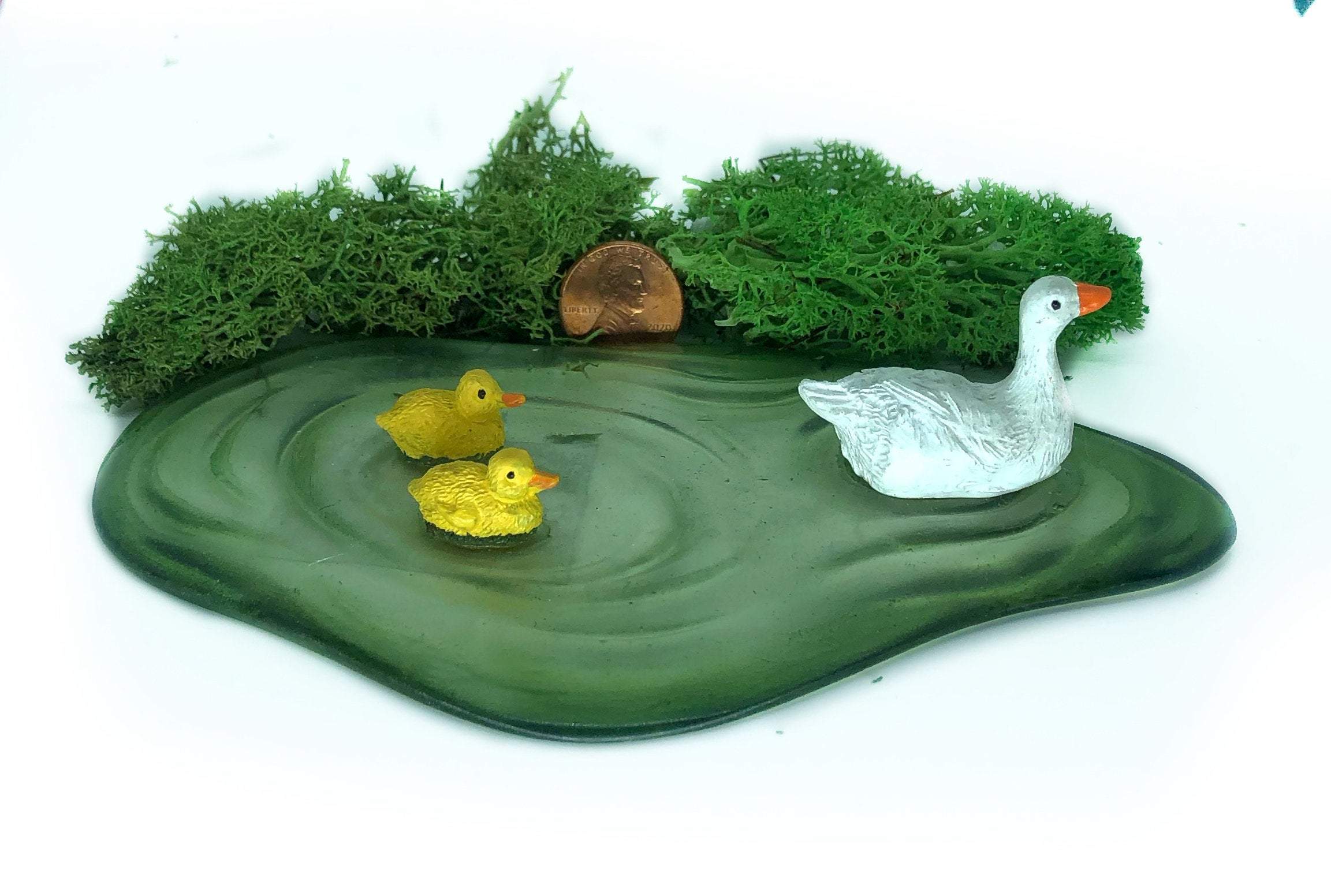 This figurine is made of resin. A white mother duck is gliding on a clear, green tinted pond. Two baby ducks are following behind her, as good little ducklings do! This tranquil miniature will work well in terrariums, potted plant displays or in fairy gardens. Look for other miniatures in our collection that will create the scene you want!