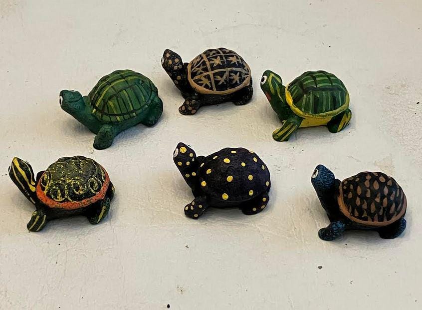 One turtle comes with this listing. Each of these turtles are made of resin. They are whimsical turtles! They are 1" x .75". There are 6 different patterns. We will choose one of these turtles to send to you. If you order more than one, we would send 2 different ones. These adorable turtles would add whimsy to a terrarium, a potted plant display or a spring fairy garden. They need a pond, a tree house, fence and some miniature animals to play with. Look for those and other miniatures in our collection.