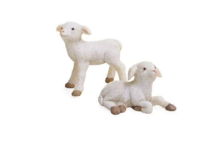 This adorable sheep pair is made of resin. The mother sheep is standing, watching over her baby. A metal stake is attached to her leg to hold her securely in a surface. The baby sheep is sitting with his legs tucked under. Both sheep are covered in textured white paint with brown hooves. This pair would give an authentic feel to a farm, fairy garden, a dollhouse yard or could be used as a cake topper. How can you use them?
