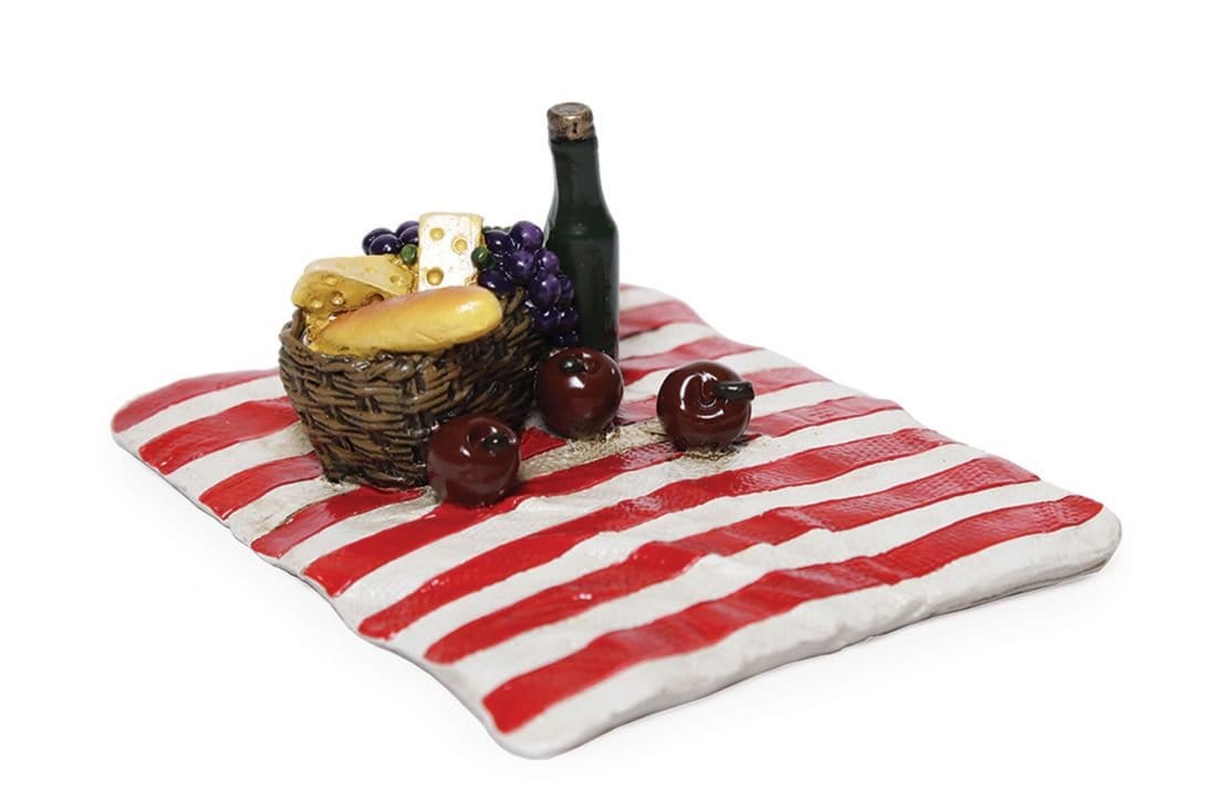 This Miniature Picnic Basket is just what your fairies and gnomes need to enjoy the outdoor dining experience! Made of resin, the blanket features a red-and-white stripe pattern with a very sophisticated basket of cheese and bread and wine on top. What fairy doesn't like wine and cheese?