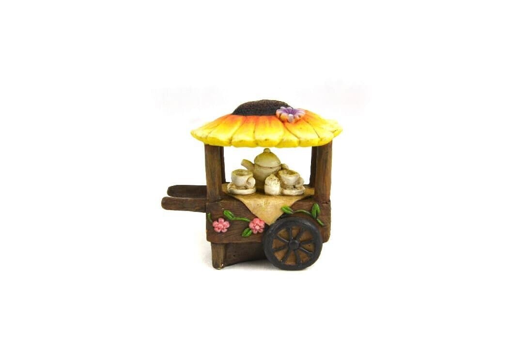 This cheerful fairy garden miniature is made of resin. The brown cart has 2 wheels that are stationary. The cart is adorned with pink and yellow flowers with green leaves. There is a white tea set under the orange and yellow sunflower roof. This spring cart would make a sweet scene with our wee folk, a pond, leaf swing, sunflower seesaw and miniature animals. Look for those and other miniatures in our collection.