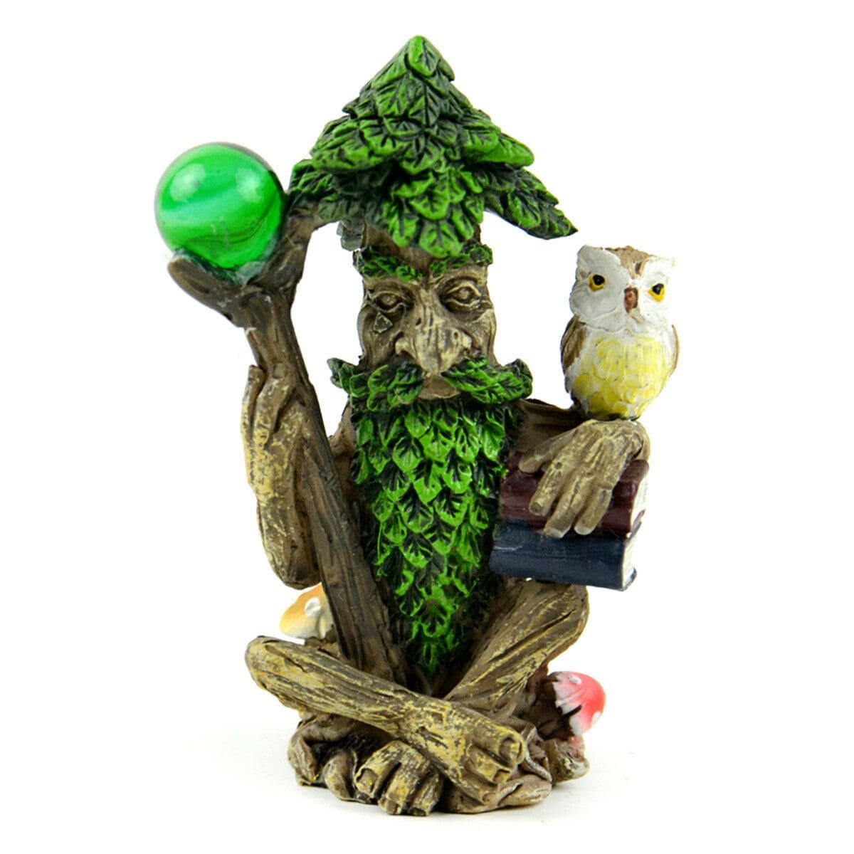Add some whimsy to your garden! This miniature is adorable! This tree wizard is made of resin. He is sitting cross-legged holding 2 books, with an owl on
