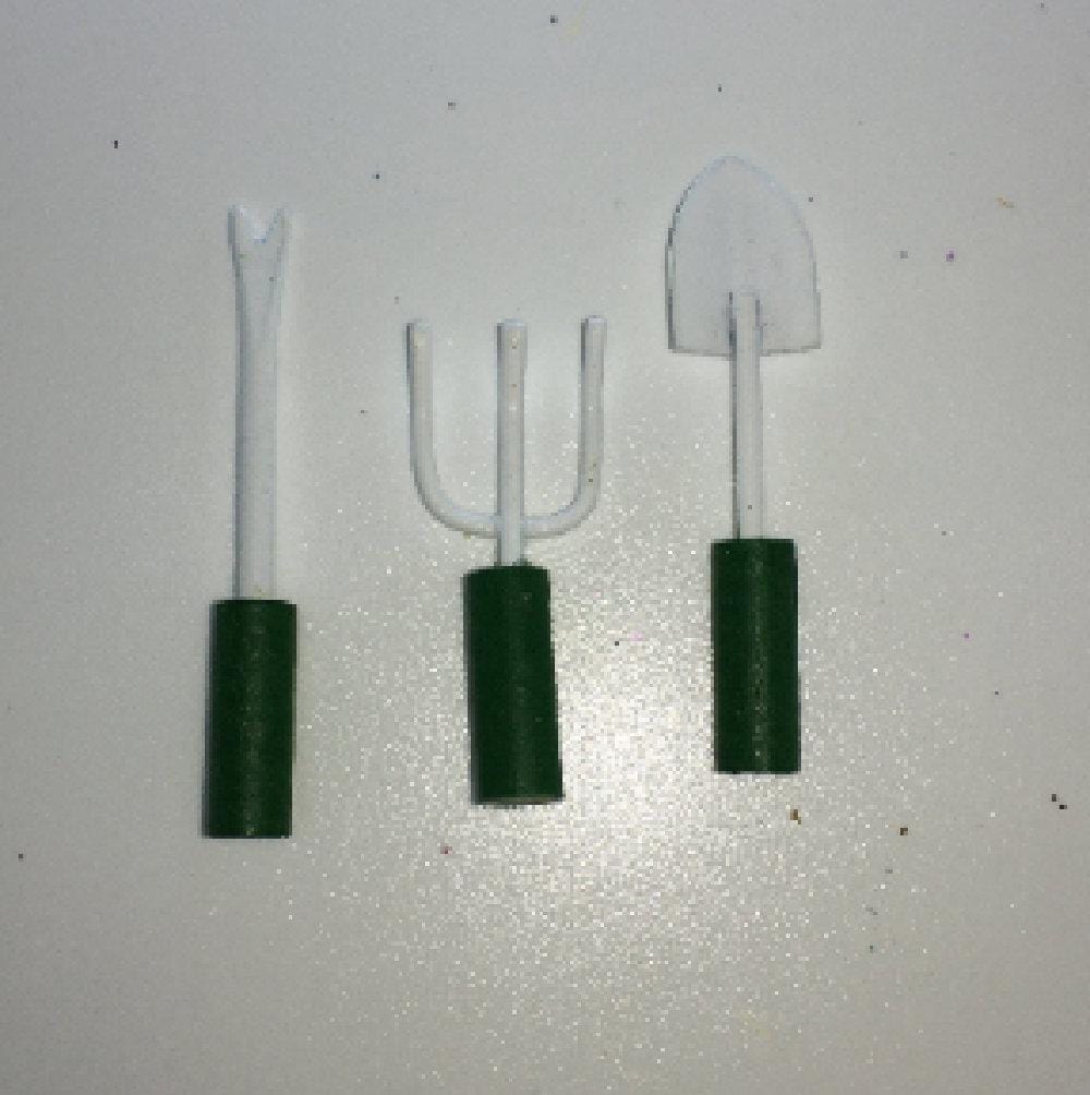 This 3 tool set is made of metal. The tools have a green handle. They are mini versions of hand tools one would use in a garden. Create a garden using these with one of our solar houses, a wishing well, straw cart and relaxing gnomes. Look for these and other miniatures in our collection.