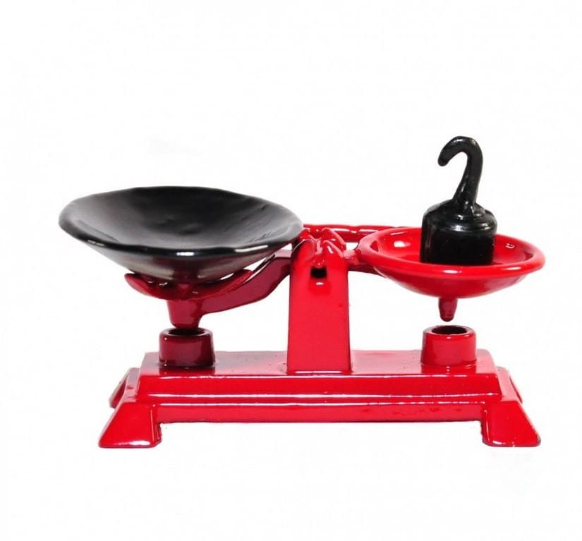 Every dollhouse kitchen needs a scale! This red and black dollhouse scale is made of metal. One balancing dish is red and the other is black, which is removable. A black weight is included with this fun replica of an early scale. Use this in a dollhouse kitchen, a shadowbox, or in a miniature cooking scene project!