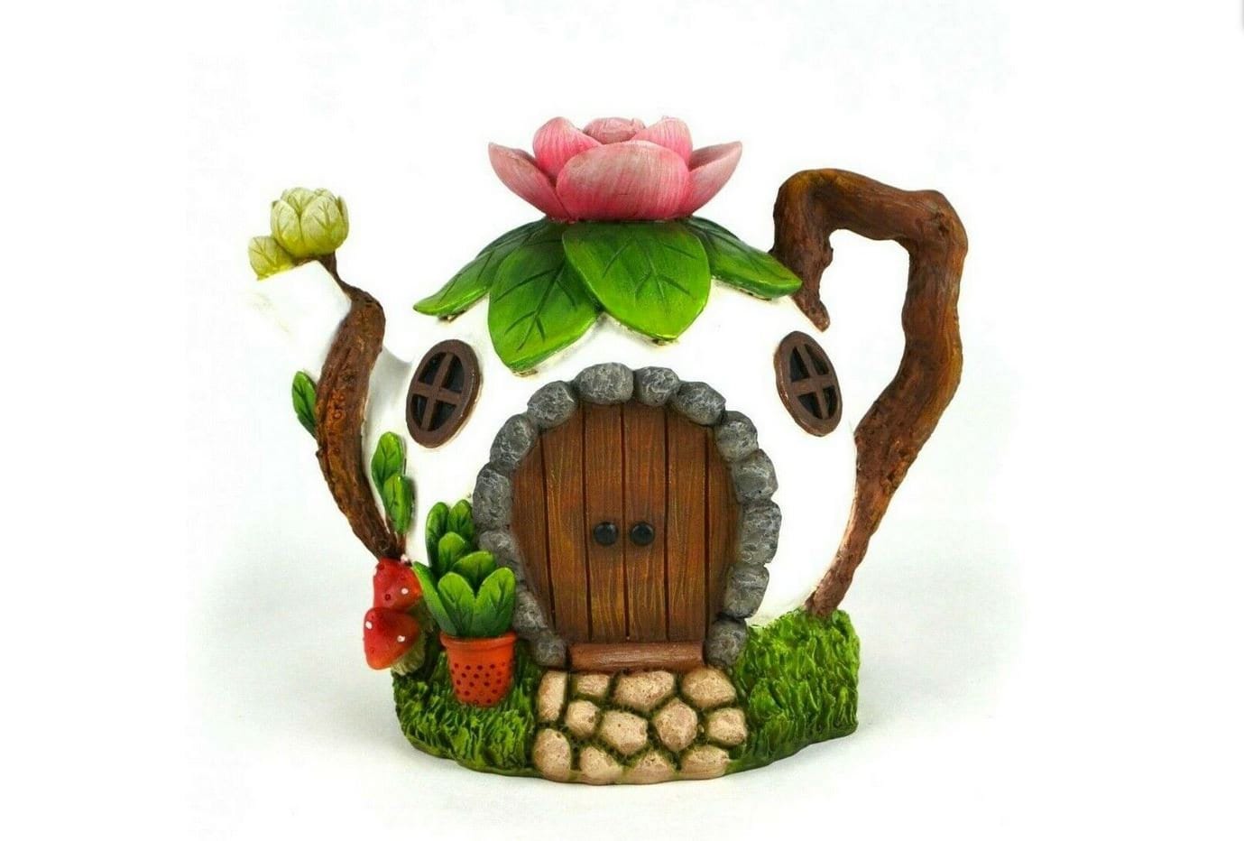 This adorable fairy garden house is made of resin. The white teapot stands on a round, green textured base that hold 2 red mushrooms and a potted plant. Brown stones lead up to the brown arched door that is surrounded by gray stones. One twisted branch makes the handle of the teapot. Another branch winds around the spout and ends with a green cabbage rose. This charming house is topped green leaves topped by a pink flower. This house is solid and does not have any openings. Add some shimmering fairies, a branch rocker, a pond, some fairy furniture and miniature animals to complete your garden. Look for those and other miniatures in our fairy garden collection.