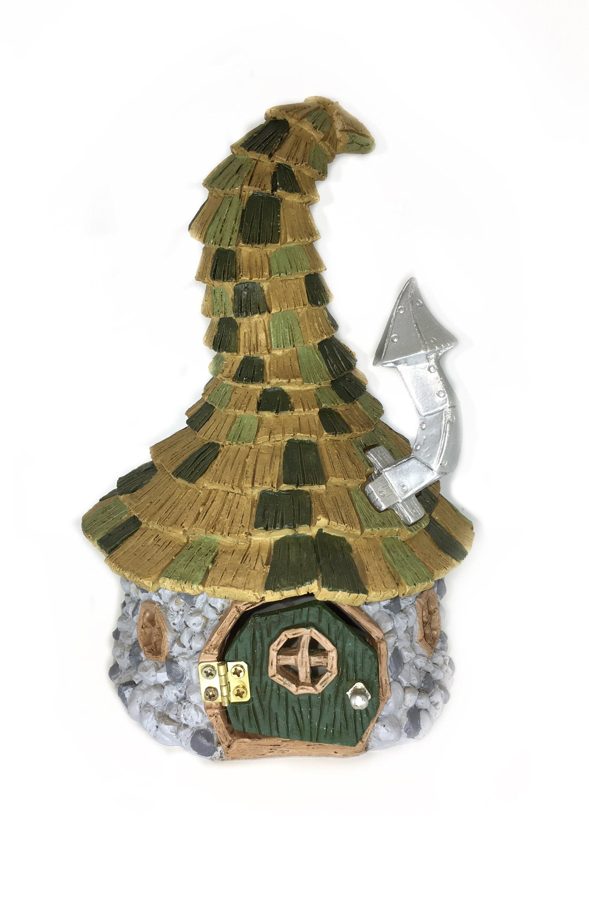 This adorable miniature fairy garden shack is made of resin. The round house is covered with gray stones with 2 small windows on the side and 1 larger window has a flower box on the back. The forest green door is hinged and can open. The curved roof with a silver chimney is made of green and goldenrod colored shingles. It is open at the bottom so you could add a light source. This miniature house from Georgetown Home and Garden is very well constructed and would make a fun addition to a garden, table centerpiece or home decoration. Add a stone path, wishing well, some wee folk, a pond and some miniature animals to create a garden with this charming wizard's shack!